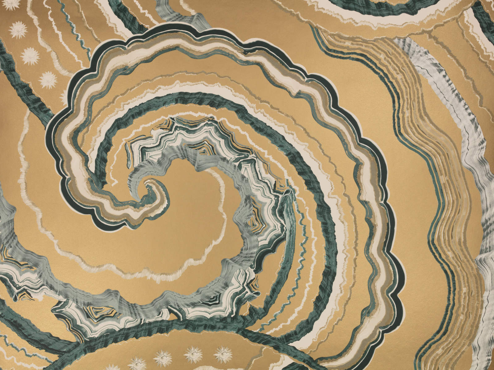 De Temperley London x Romo collectie Fantasia - Vintage Gold W449/04 van Romo is een betoverend behang met hypnotiserende agaat-geïnspireerde wervelingen die een psychedelische elegantie uitstraalt. Het behang is verfraaid met sprankelende metallic accenten die het oog vangen.