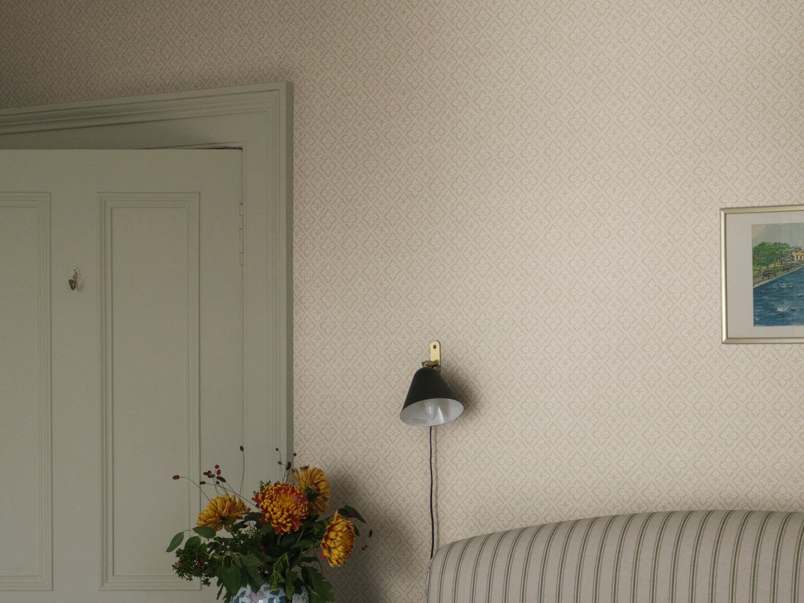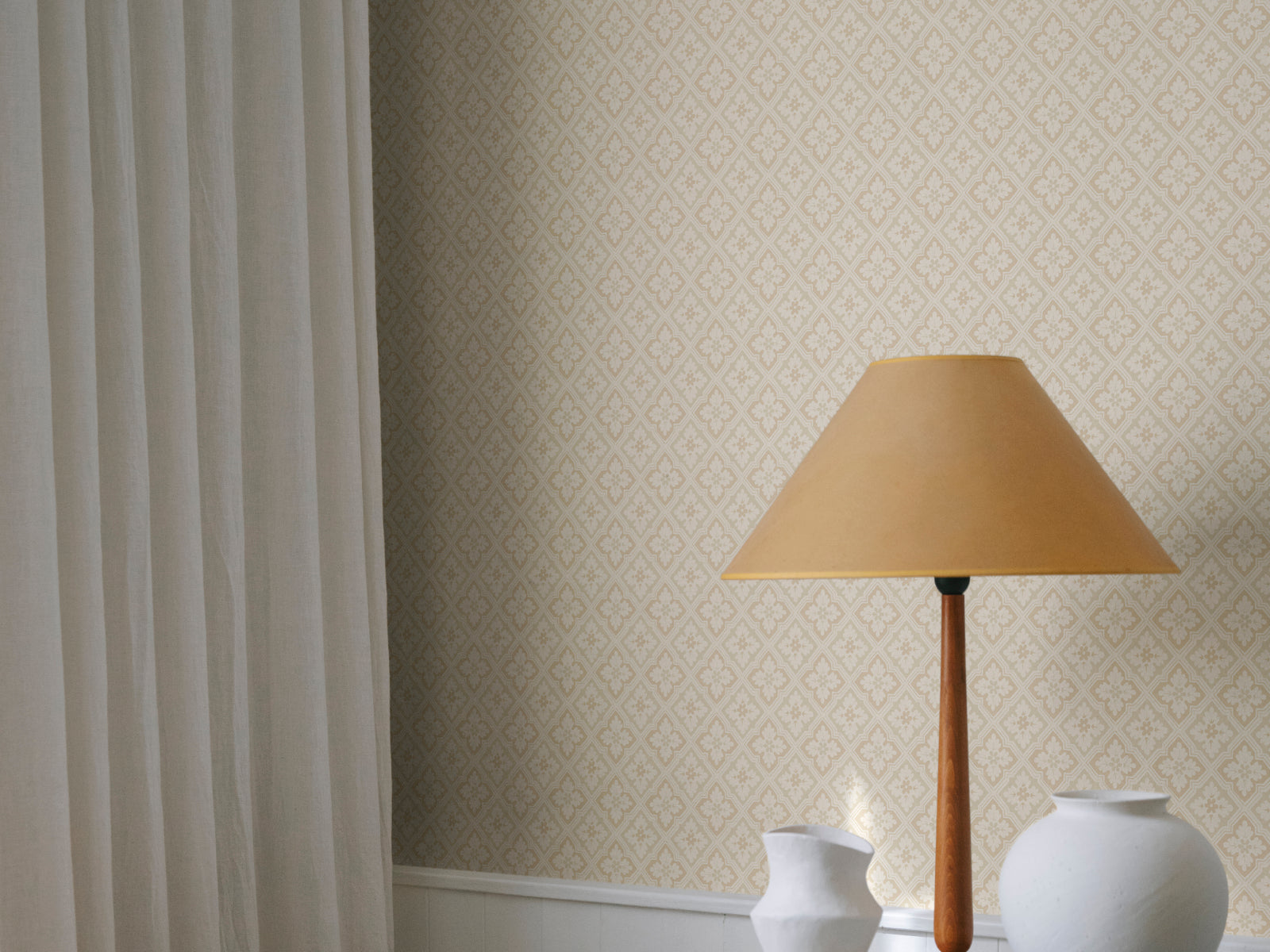 Met Oland Edvin van Sandberg haal je de sfeer van 19e-eeuwse elegantie in huis. Dit klassieke trellisbehang combineert een verfijnde ruitstructuur met bloemvormige details die samen een ornamentaal patroon vormen, geïnspireerd op historische plafonddecoraties. De bloemen lijken op klavertjesvier en vormen samen een ritmisch, rustgevend geheel dat zowel traditioneel als eigentijds aanvoelt.