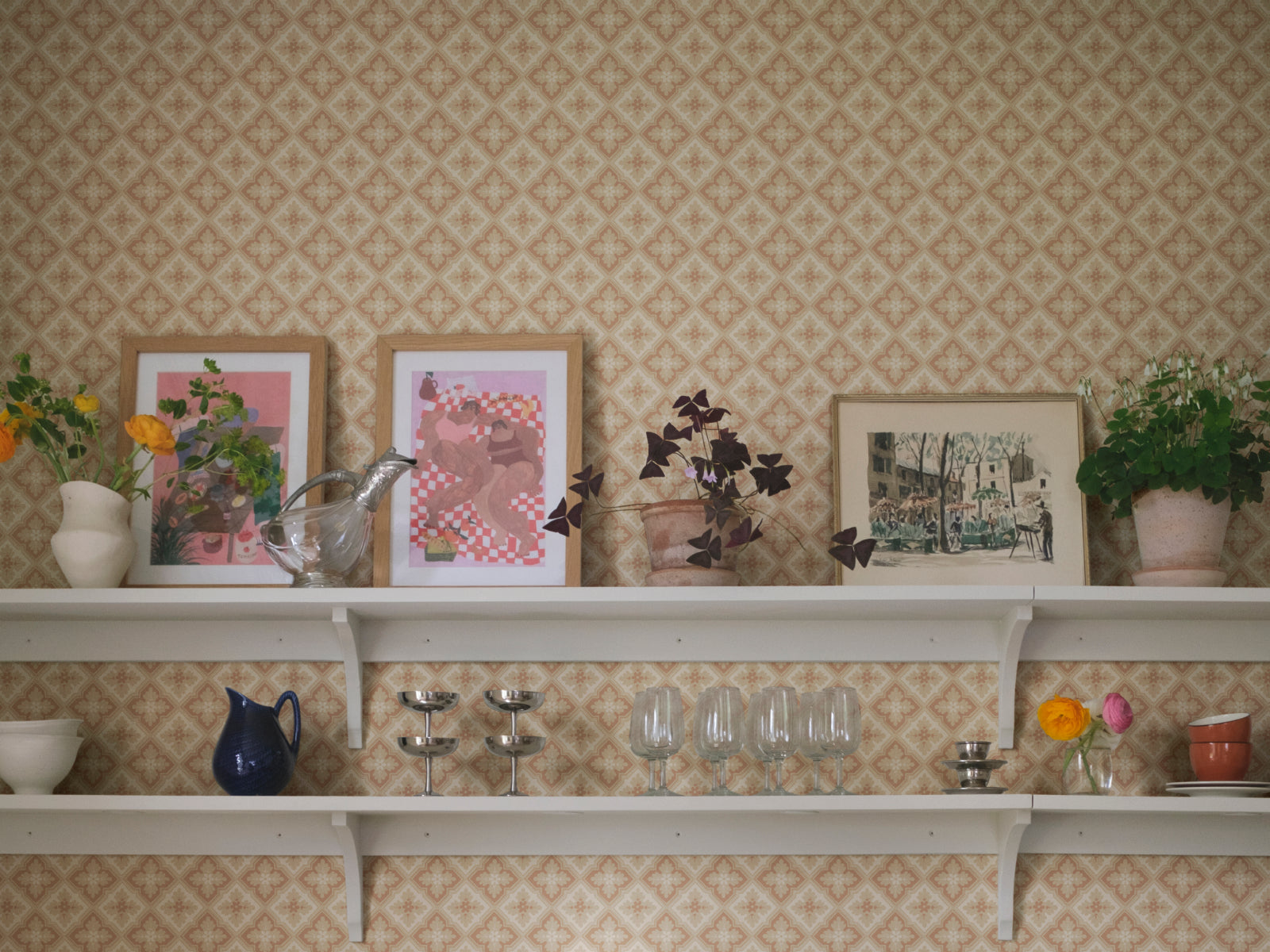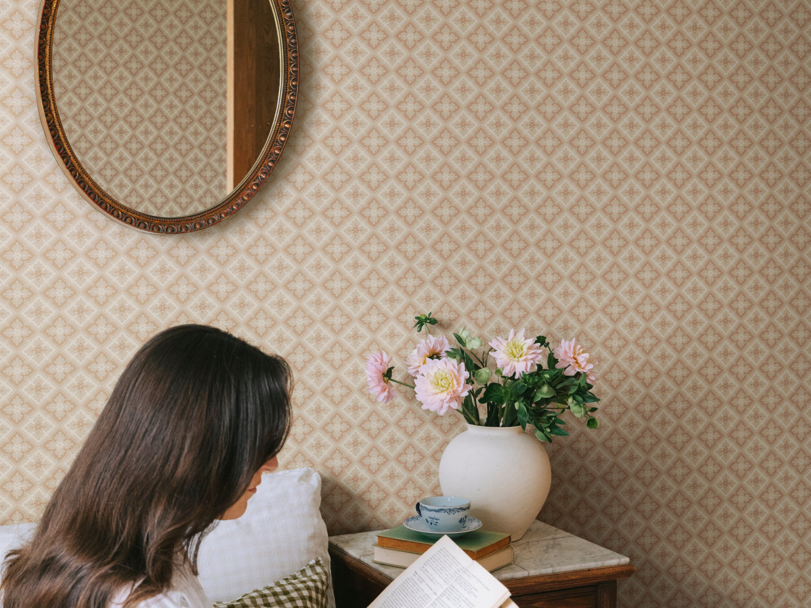 Met Oland Edvin van Sandberg haal je de sfeer van 19e-eeuwse elegantie in huis. Dit klassieke trellisbehang combineert een verfijnde ruitstructuur met bloemvormige details die samen een ornamentaal patroon vormen, geïnspireerd op historische plafonddecoraties. De bloemen lijken op klavertjesvier en vormen samen een ritmisch, rustgevend geheel dat zowel traditioneel als eigentijds aanvoelt.