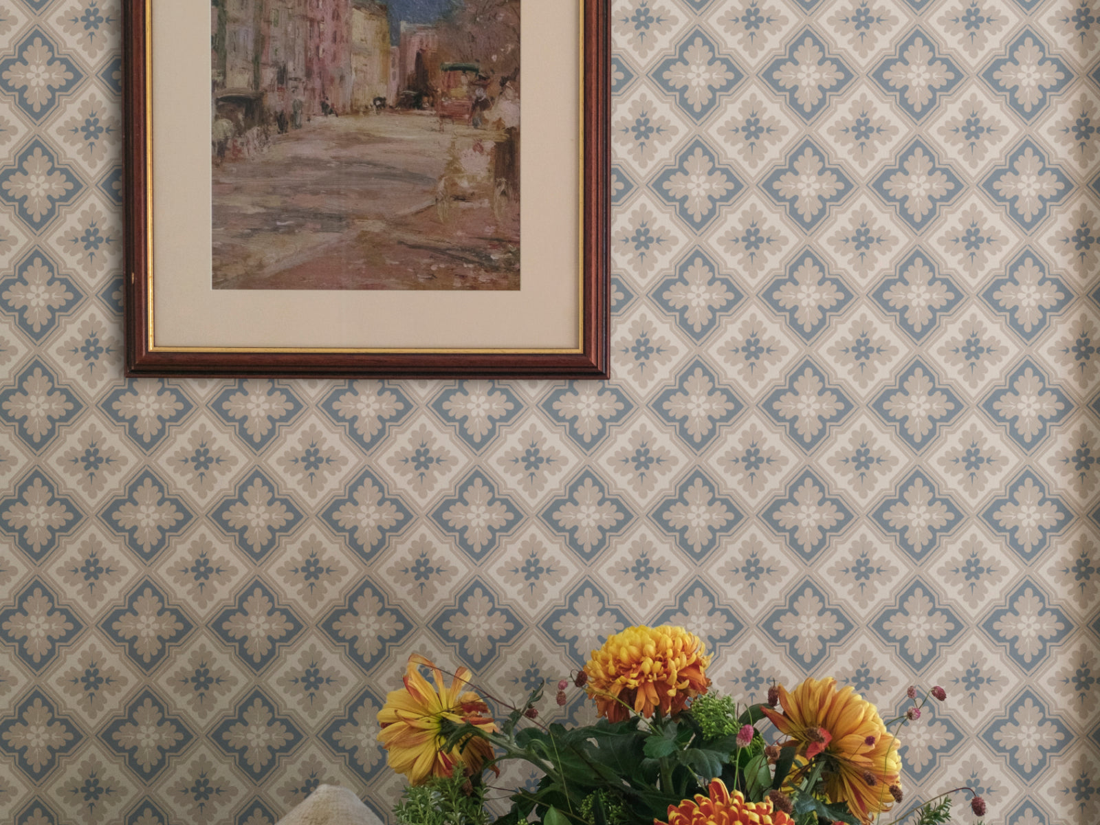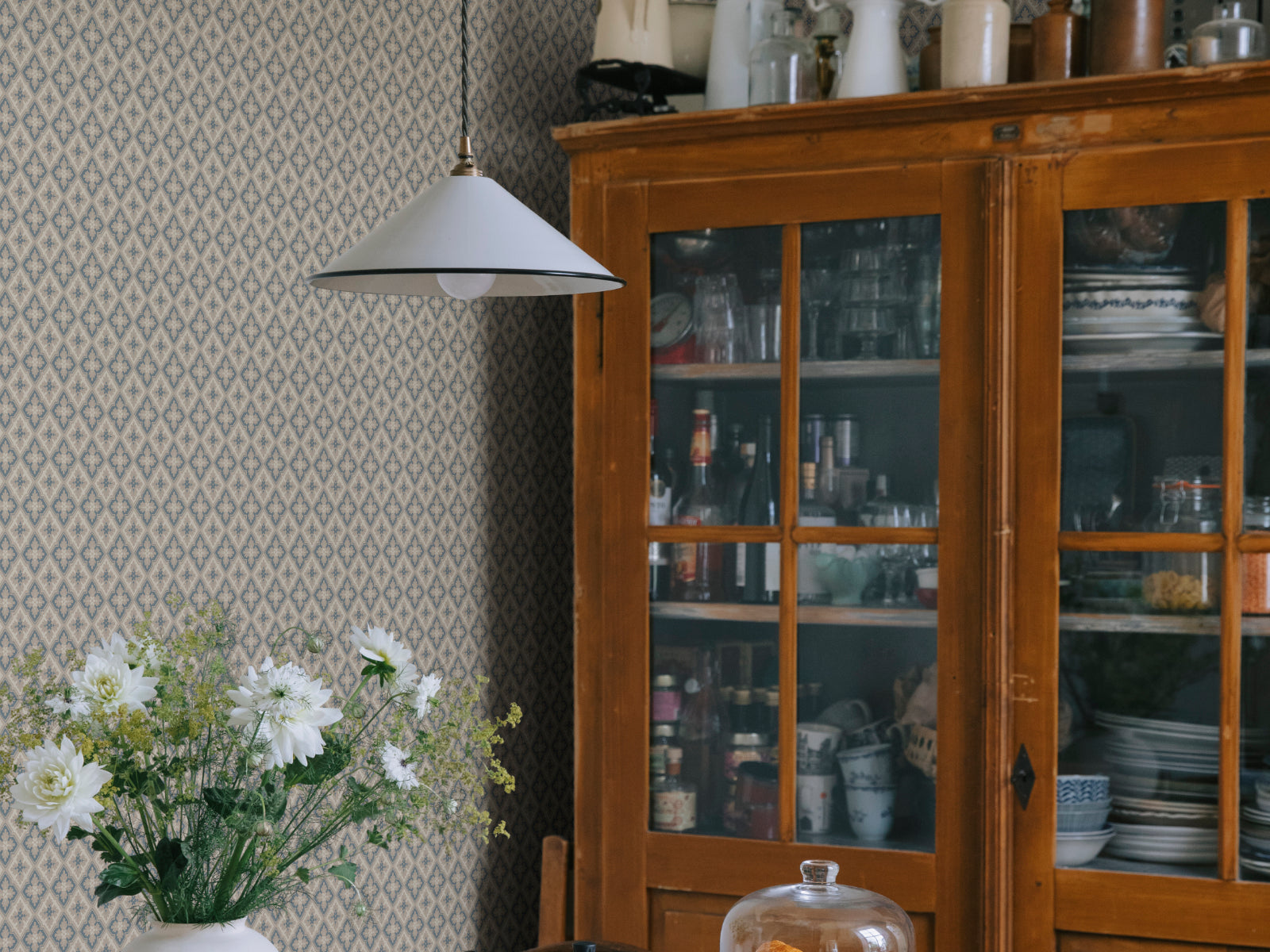 Met Oland Edvin van Sandberg haal je de sfeer van 19e-eeuwse elegantie in huis. Dit klassieke trellisbehang combineert een verfijnde ruitstructuur met bloemvormige details die samen een ornamentaal patroon vormen, geïnspireerd op historische plafonddecoraties. De bloemen lijken op klavertjesvier en vormen samen een ritmisch, rustgevend geheel dat zowel traditioneel als eigentijds aanvoelt.