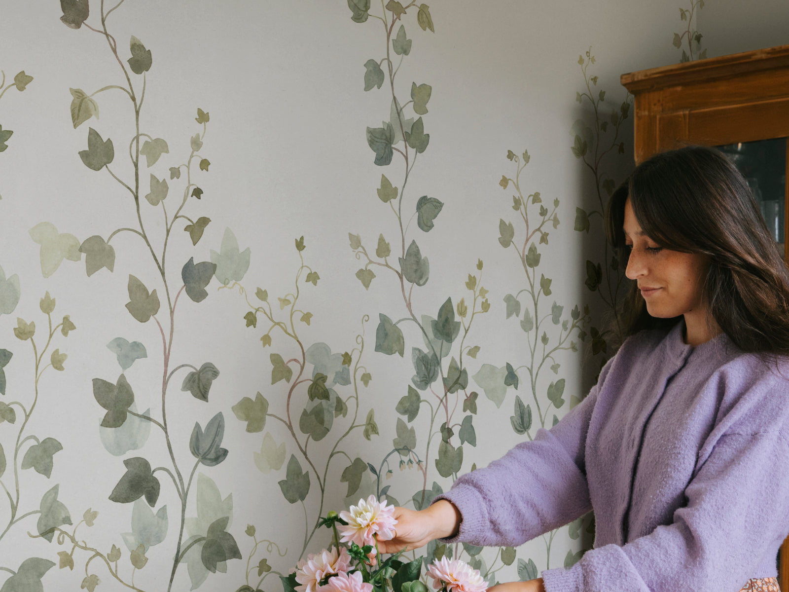 Breng een verfijnd stukje natuur in huis met de Öland Ivy mural van Sandberg. Dit panorama behang toont sierlijke bladeren en subtiele bloemetjes die nog net in bloei lijken te staan. De fijne lijnen en natuurlijke compositie geven een kalm, botanisch effect dat perfect past in een rustige, stijlvolle leefomgeving.