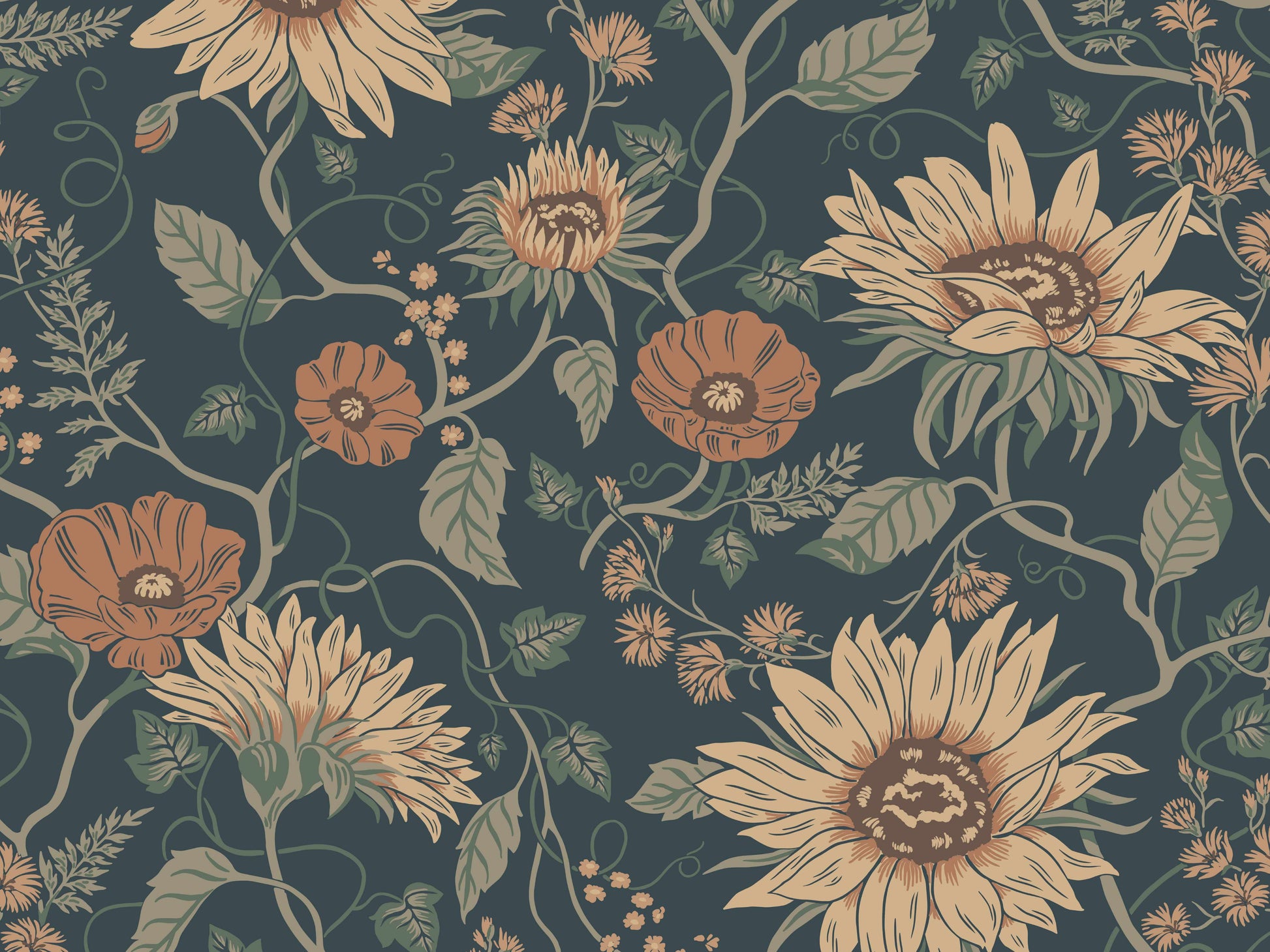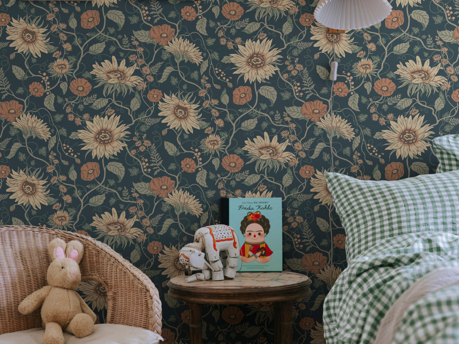 Vier de rijkdom van de natuur met het Öland Solveig behang van Sandberg. Dit bloemrijke ontwerp toont een bloemenfestijn van zonnebloemen, klaprozen en cichorei, liefdevol gecombineerd tot een levendig botanisch patroon. De warme kleuren en sierlijke bladeren geven je muur een natuurlijke gloed, geïnspireerd op het zonovergoten eiland Öland.
