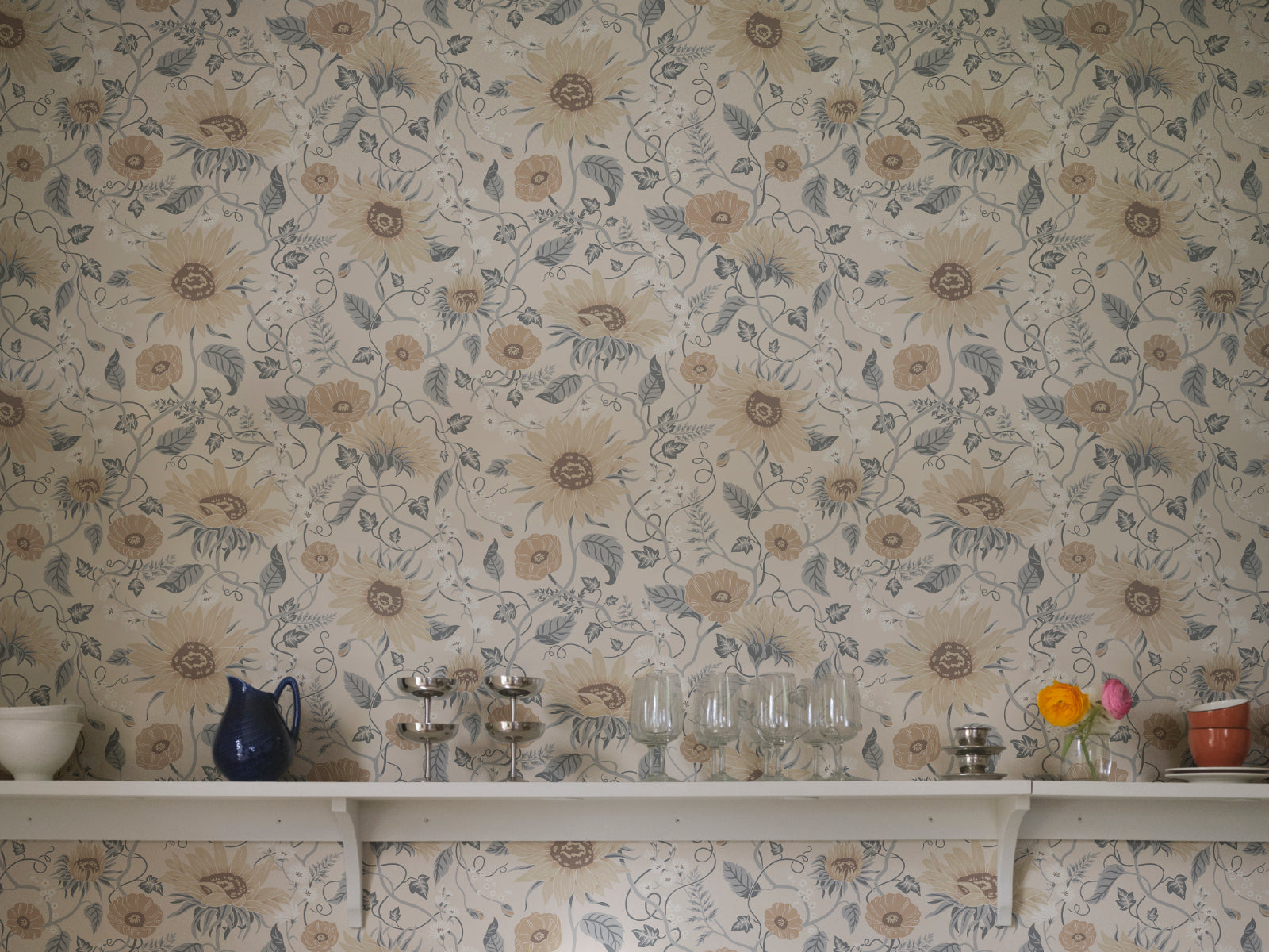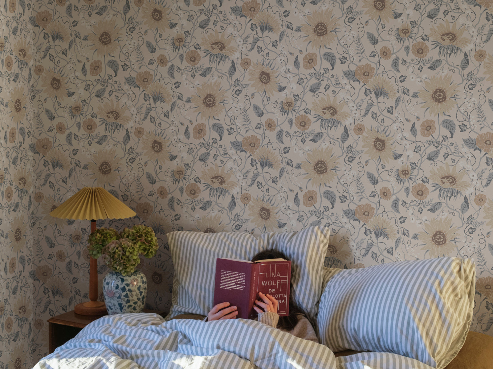 Vier de rijkdom van de natuur met het Öland Solveig behang van Sandberg. Dit bloemrijke ontwerp toont een bloemenfestijn van zonnebloemen, klaprozen en cichorei, liefdevol gecombineerd tot een levendig botanisch patroon. De warme kleuren en sierlijke bladeren geven je muur een natuurlijke gloed, geïnspireerd op het zonovergoten eiland Öland.