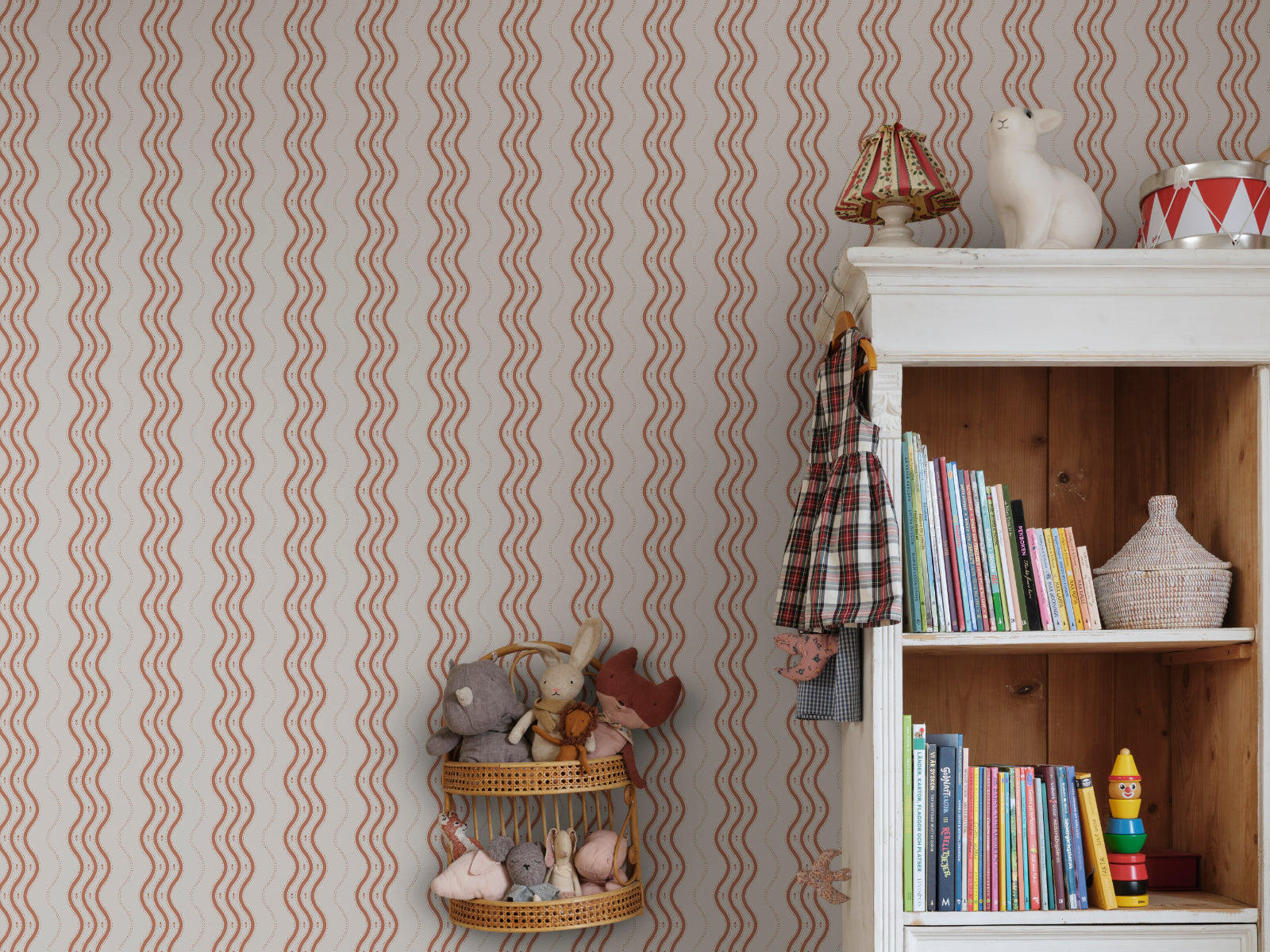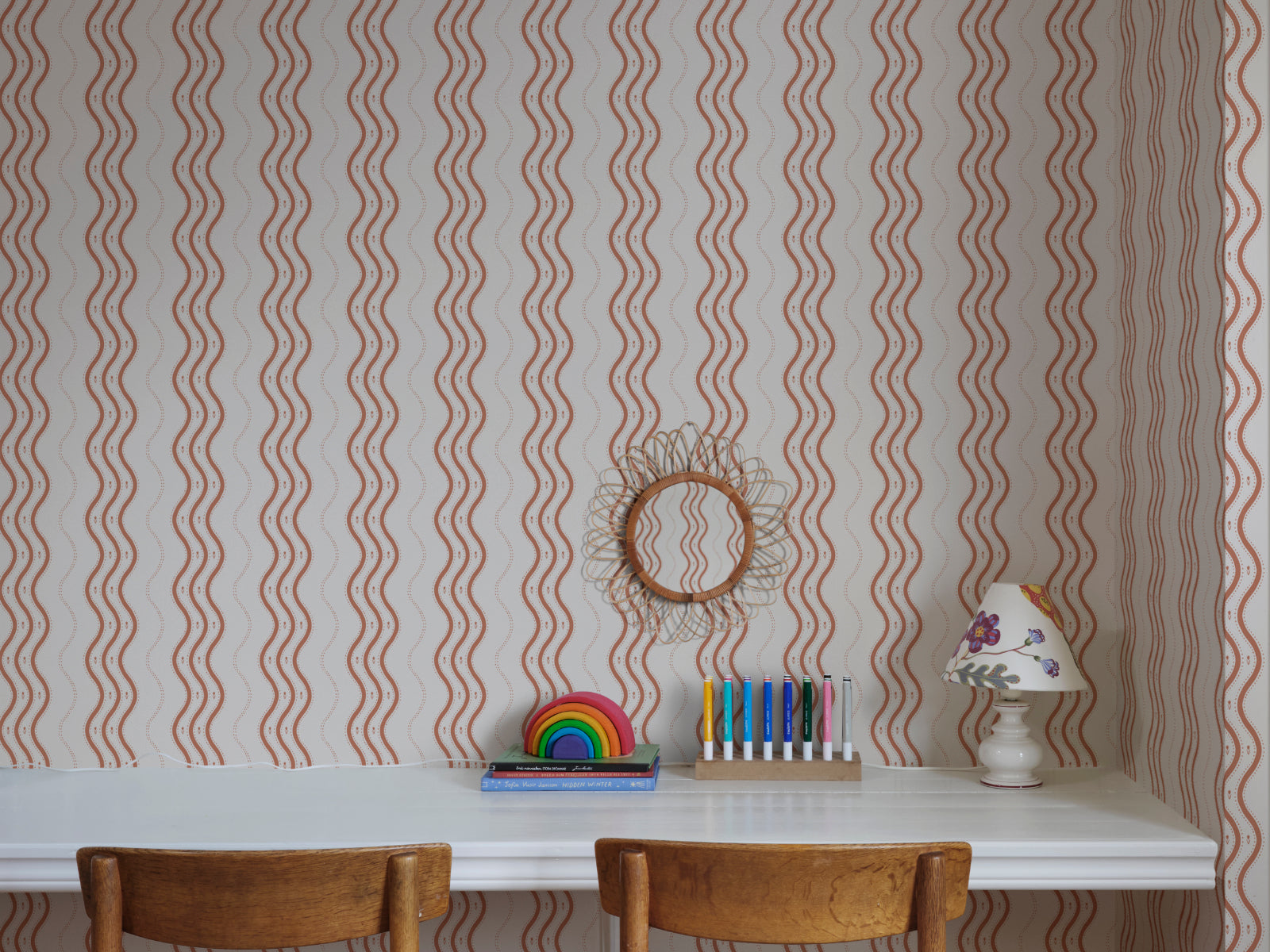 Sandberg Tidlösa Ben is een gedurfde interpretatie van het klassieke streepbehang. Het patroon bestaat uit golvende lijnen die speels over de muur dansen, afgewisseld met kleine krokusbloemen en fijne stipjes. Een subtiele verwijzing naar het bloemmotief uit het Betty behang. Dit ontwerp combineert humor met verfijning en geeft je ruimte een unieke, vrolijke uitstraling.
