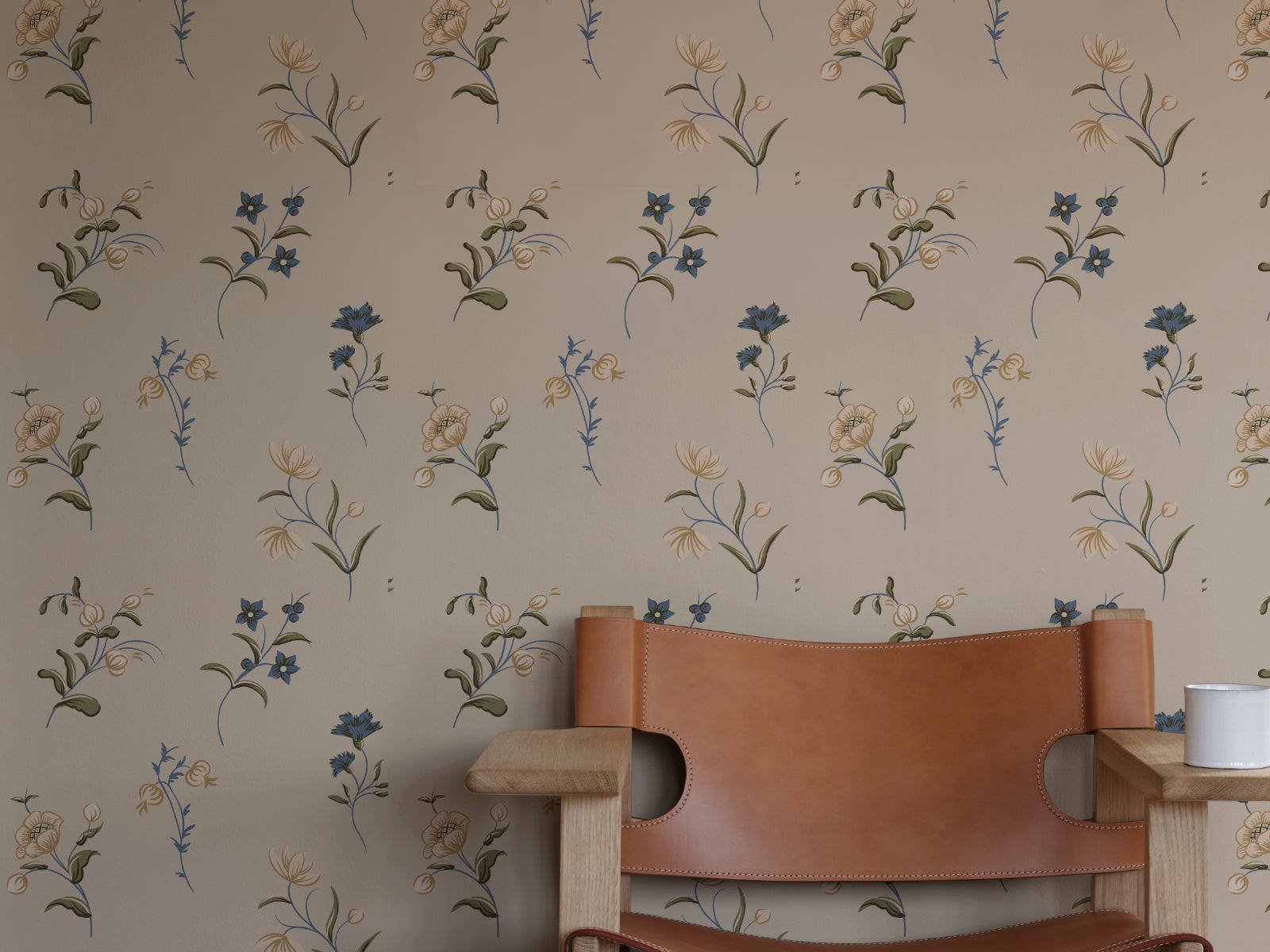 Met Tidlösa Hanna van Sandberg brengt dit behang een ode aan Zweedse volkskunst en de decoratieve schilderstijl van de 18e eeuw. Dit bloemrijke behang toont een verzameling sierlijke, individueel uitgewerkte bloemen in krachtige penseelstreken die ogen als met de hand geschilderd. Het speelse patroon geven je muur een warme, ambachtelijke uitstraling met een authentieke knipoog naar het verleden.