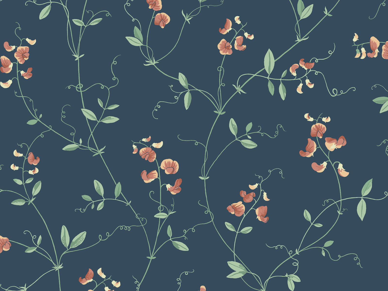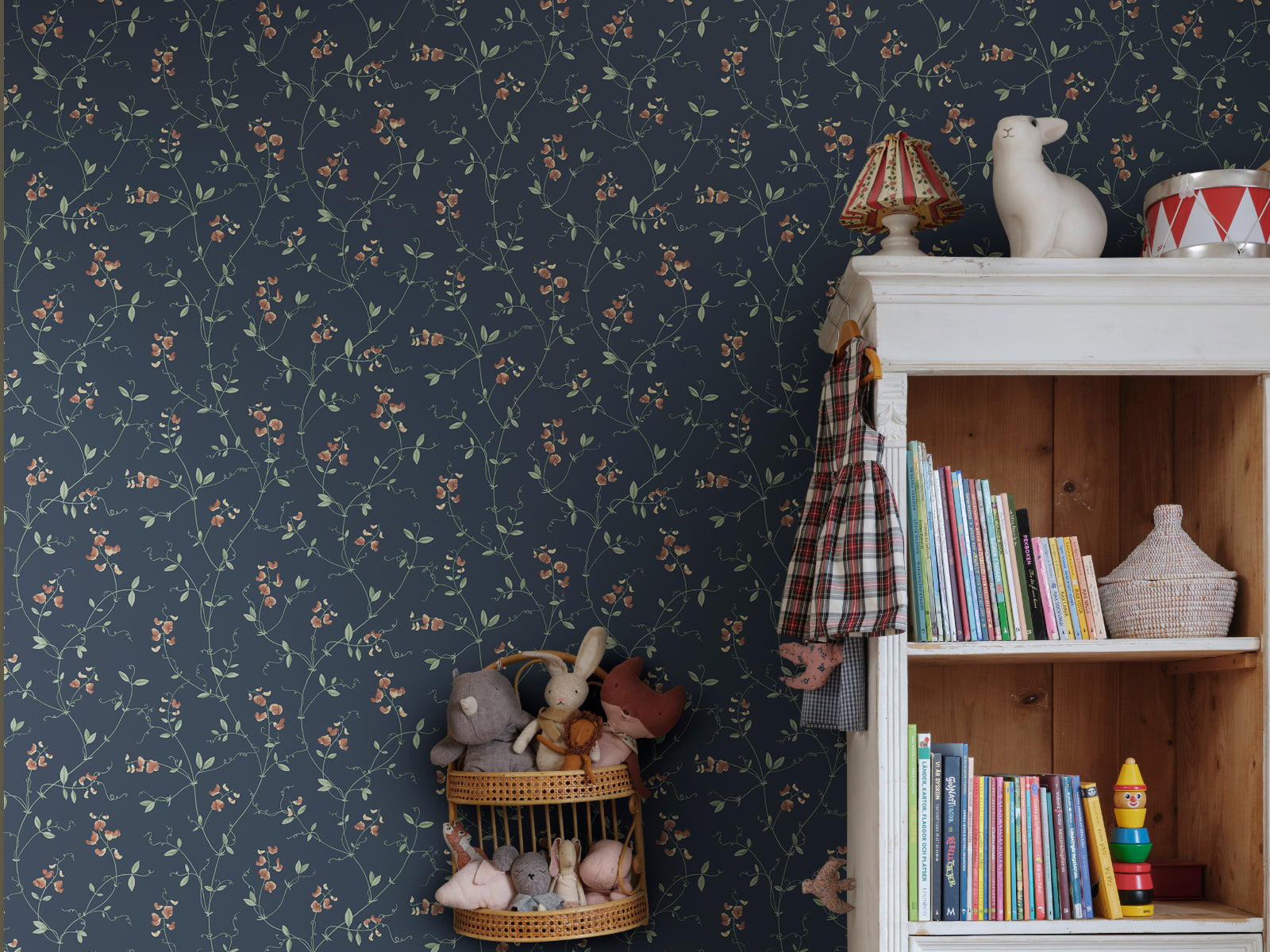 Sanna van Sandberg is een van de lievelingen uit de Tidlösa collectie en dat is niet zonder reden. Dit verfijnde bloemenbehang toont sierlijke erwtenbloemen met elegante stelen en fijne bladeren, die in een vloeiend ritme over de muur lijken te zweven. Het luchtige ontwerp straalt rust uit, terwijl het rijke kleurenschema zorgt voor diepte en natuurlijke elegantie.