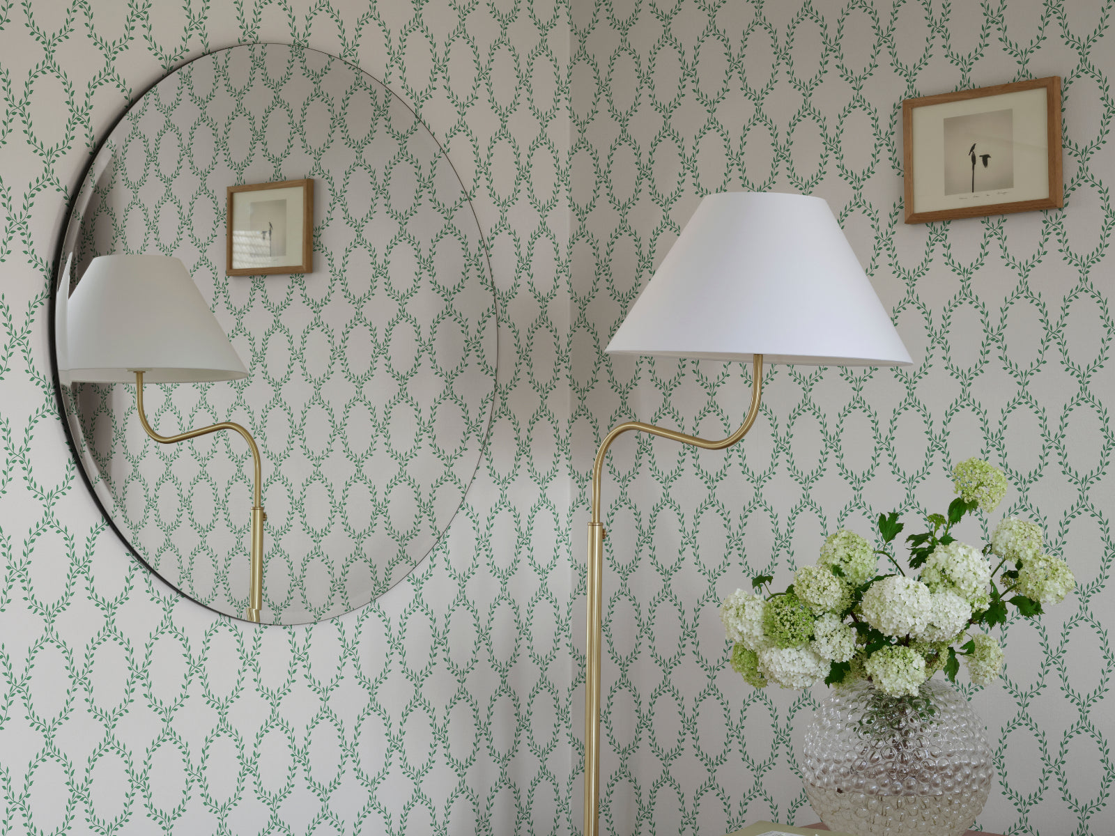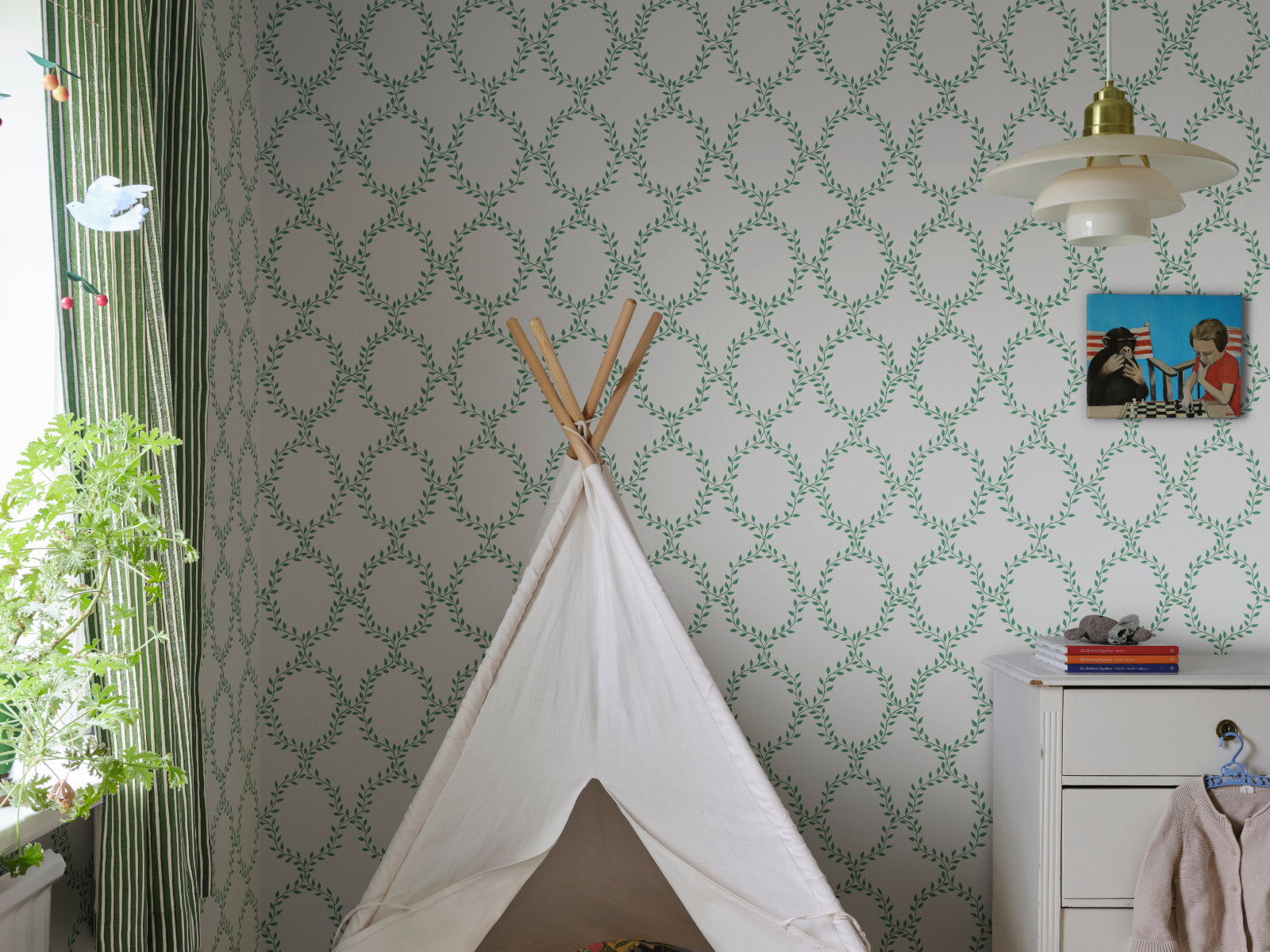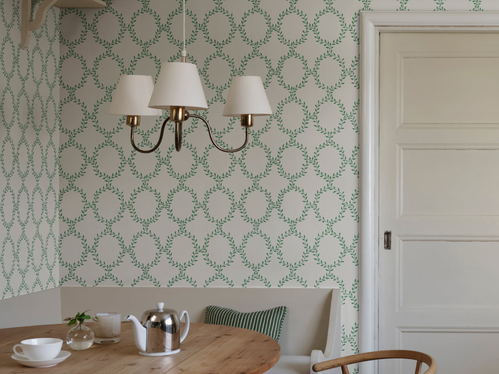 Tidlösa Wilma van Sandberg is een charmant behang waarin romantiek en structuur samenkomen. Het bestaat uit elegante kransen die in een ritmisch patroon over de muur zijn verdeeld. Elke krans is rijk aan botanische details en straalt een verfijnde, internationale sfeer uit, terwijl het ontwerp tegelijkertijd een warme, ambachtelijke uitstraling behoudt. Ontworpen door Hanna Wendelbo Hansson, met een subtiele balans tussen klassiek en eigentijds.