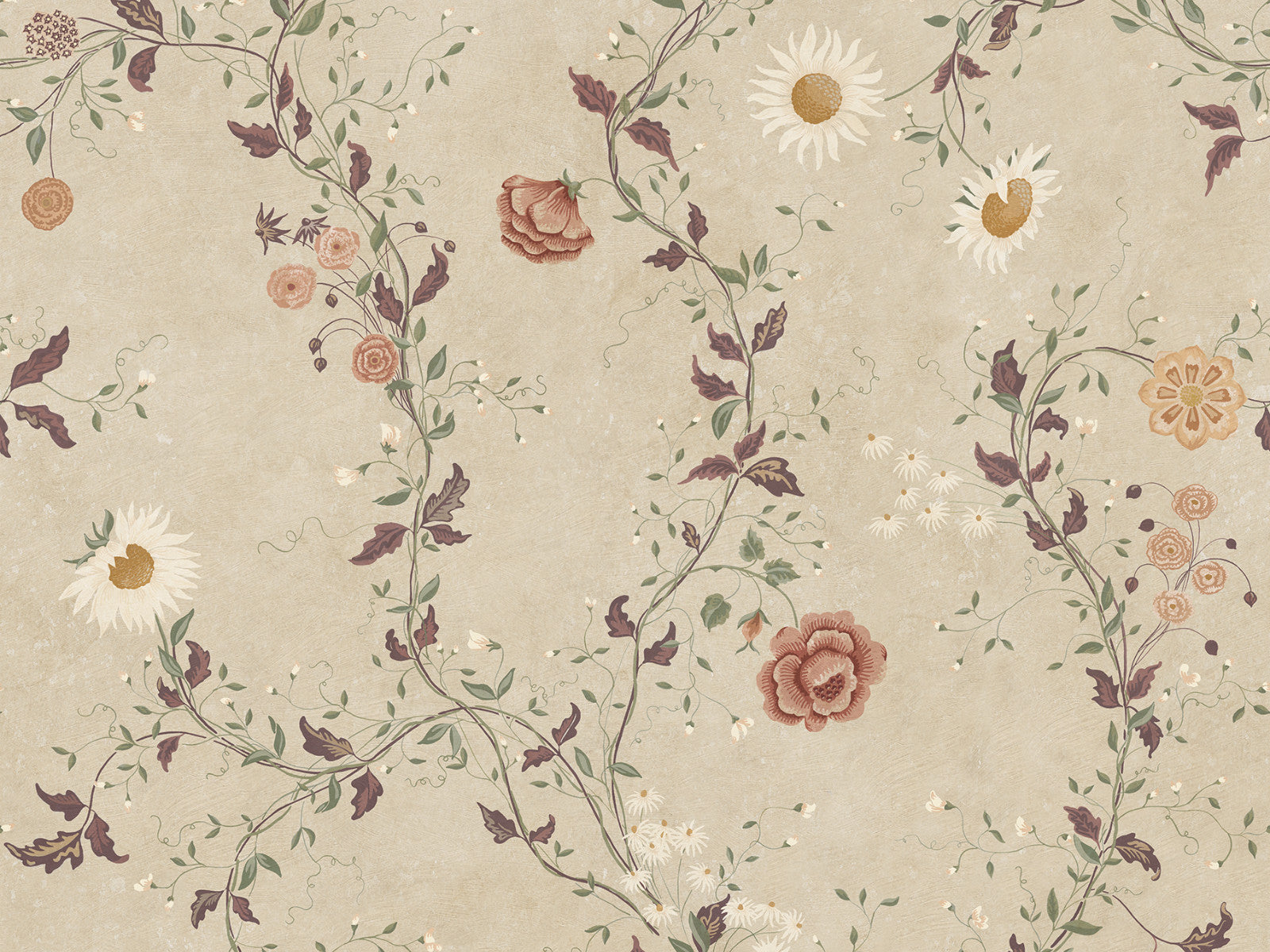 Met het Sandberg Trädgården Inger panorama haal je een weelderige bloemencompositie in huis die doet denken aan een met zorg geschilderd tuintafereel. Zonnebloemen, dahlia’s, bosasters en zoete erwten kronkelen sierlijk langs elkaar heen, met lange stelen en fijn gedetailleerde bladeren en knoppen die nog op het punt staan te bloeien. De achtergrond van verweerde steen geeft dit ontwerp een eigentijdse vintagelook vol karakter en diepte.
