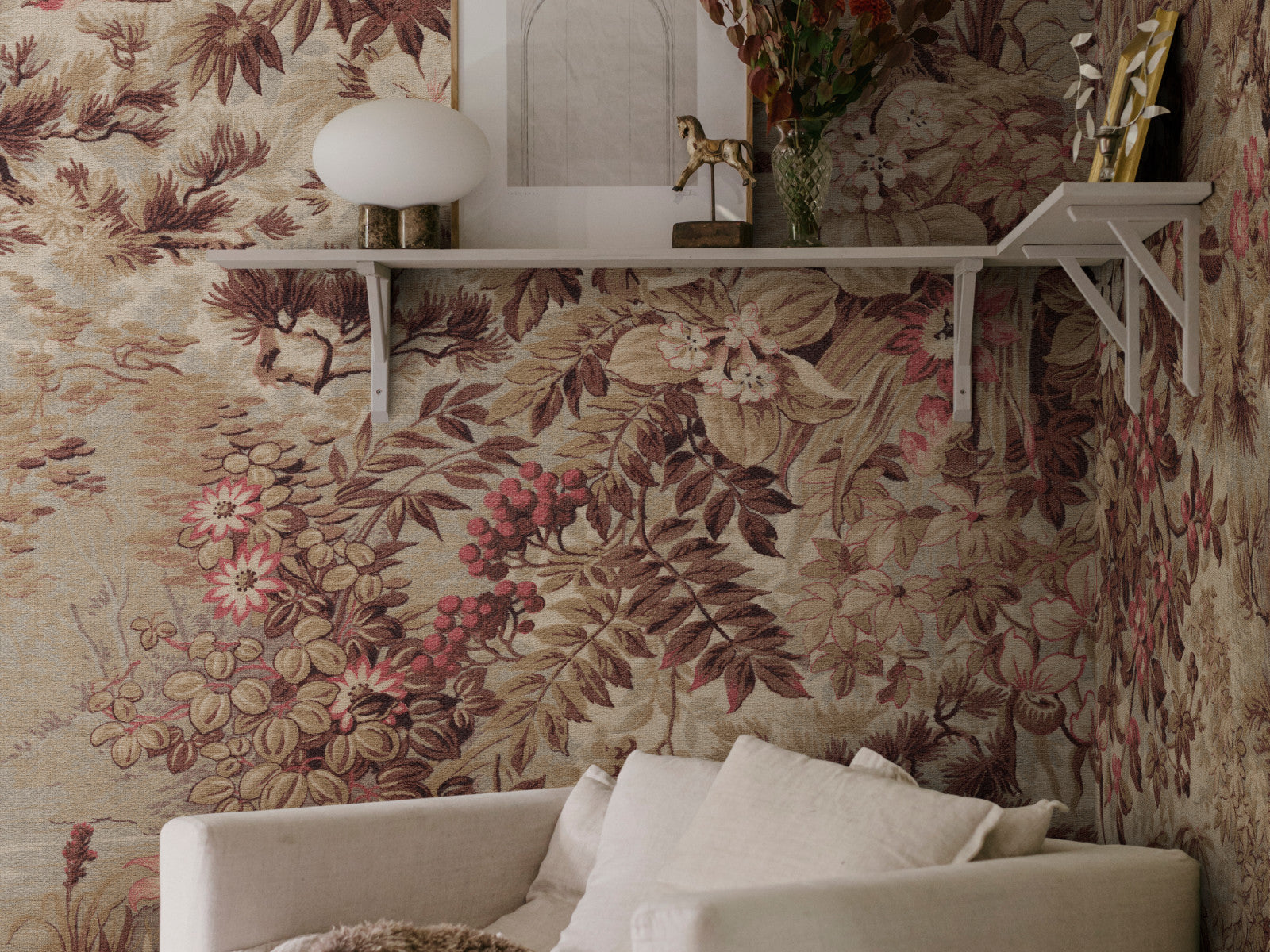 Stap een serene bostuin binnen met het Sandberg Trädgården Johannas Damm panorama. Dit botanische ontwerp omhult je ruimte met een weelderig tafereel van bomen, planten en subtiele bloesems, met hier en daar een vleugje bes. De zachte, textielachtige structuur geeft je muren een warme, uitnodigende uitstraling, alsof de natuur zelf je kamer omarmt.