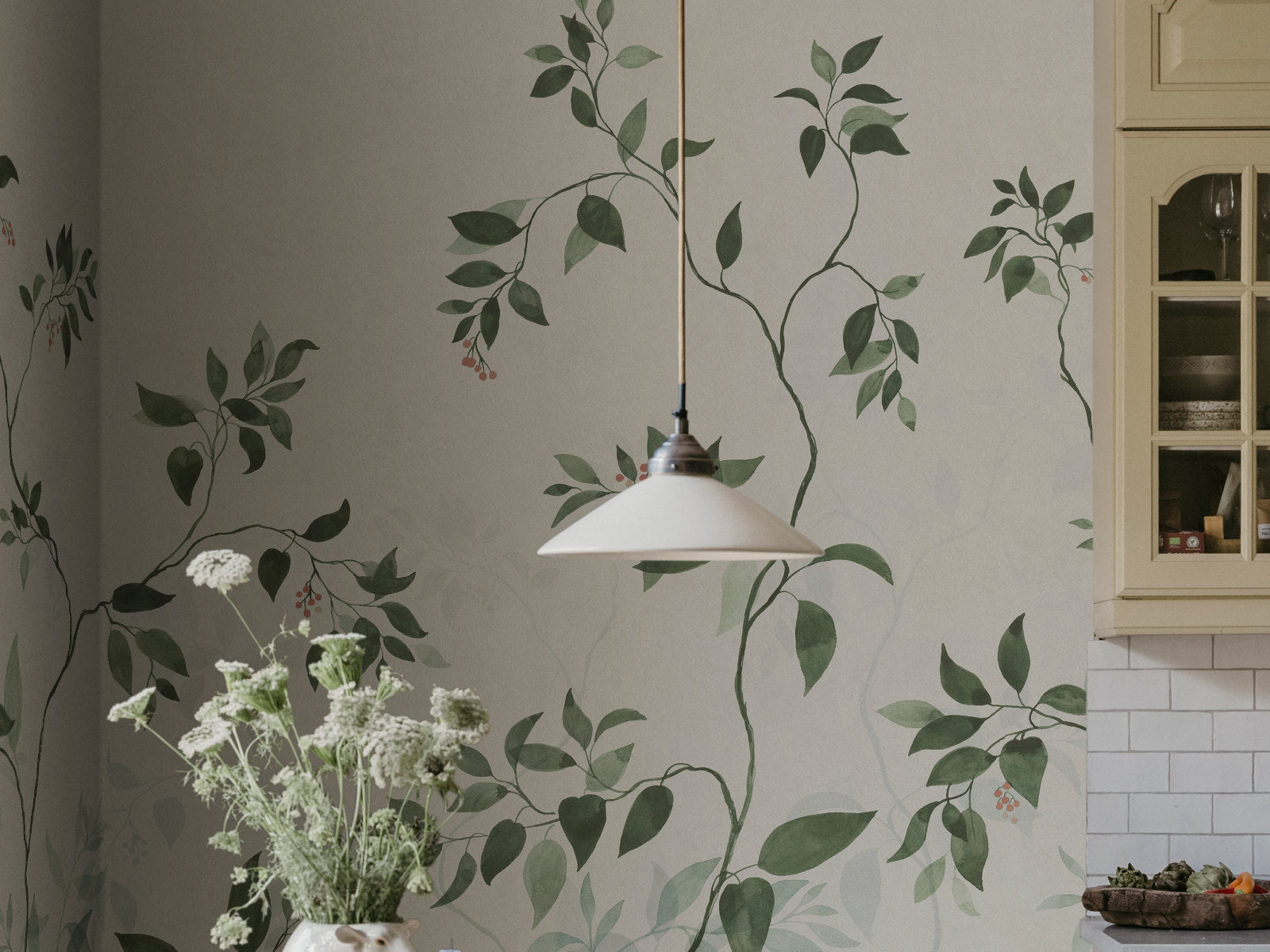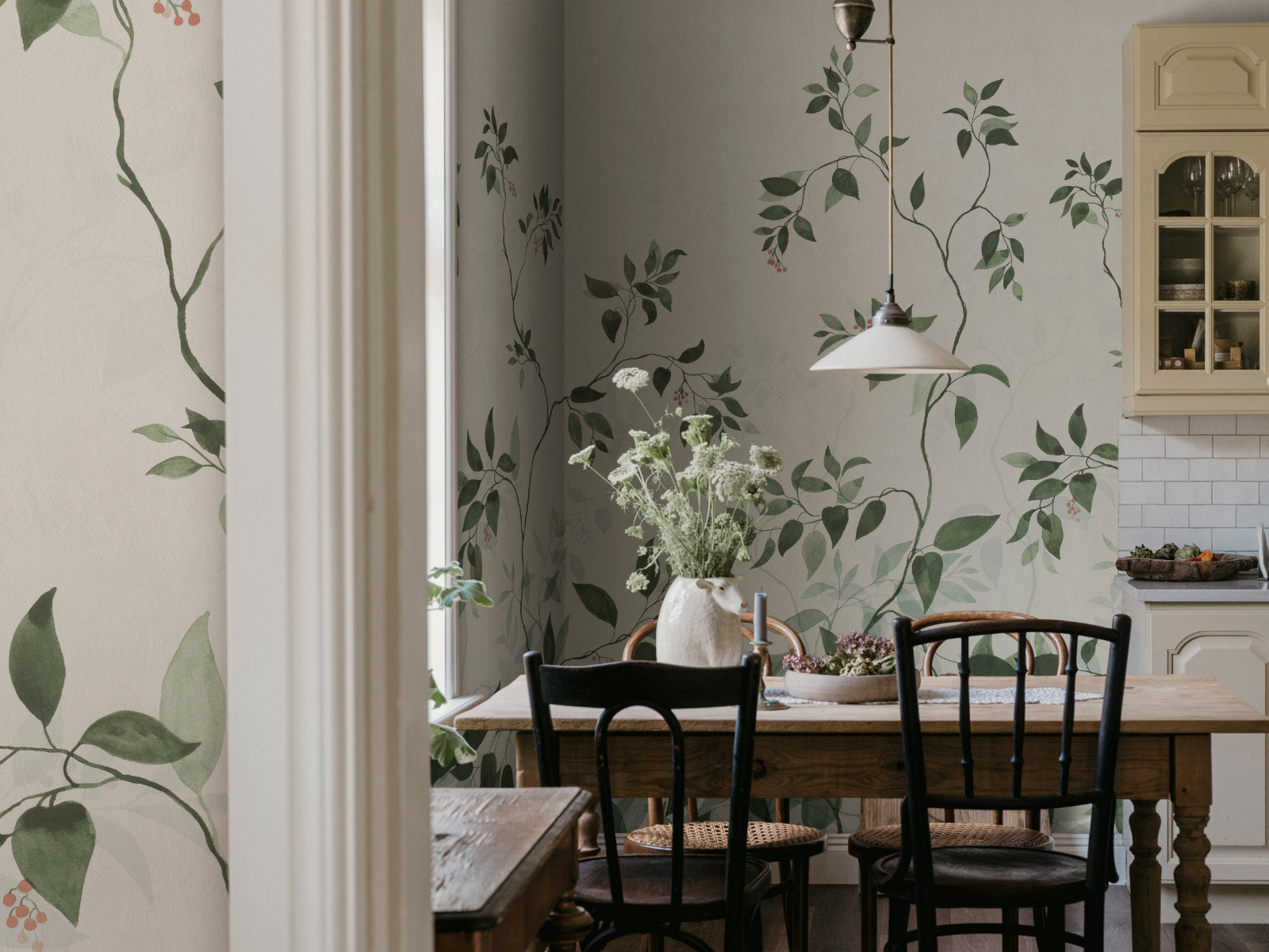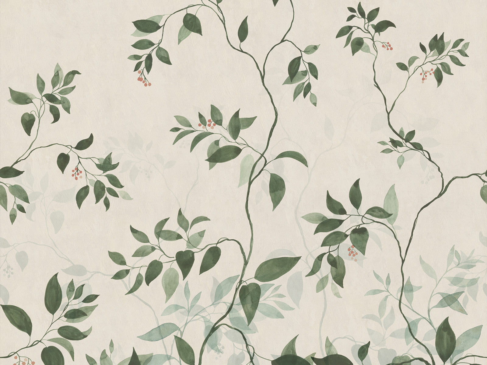 Het Sandberg Trädgården Josefine behang laat je wegdromen in een rustgevend, botanisch tafereel. Deze panorama toont groot formaat bloemen met sierlijk opklimmende stelen, subtiele bladeren en hier en daar kleine bessen. Dat zorgt voor een zachte, natuurlijke uitstraling en creëert een gevoel van diepte en elegantie op je muur. Ideaal voor wie een rustige, verfijnde sfeer in huis wil brengen.