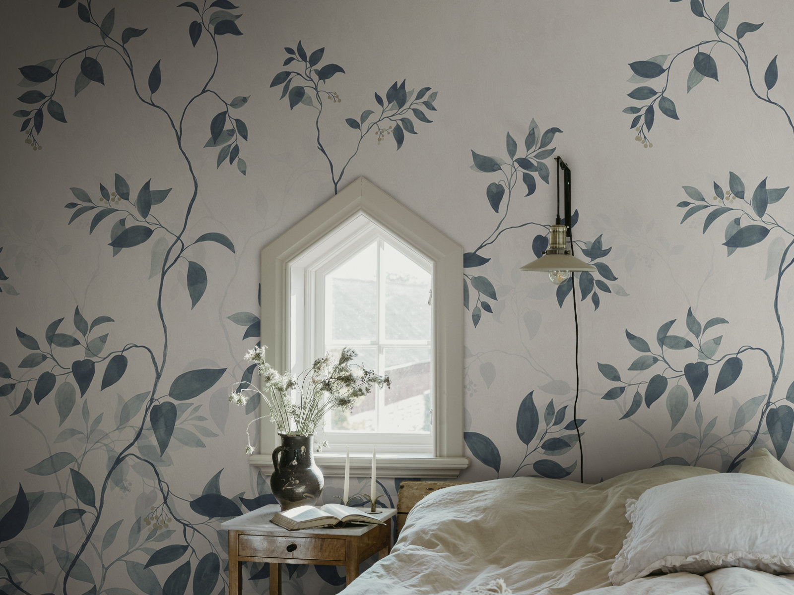 Het Sandberg Trädgården Josefine behang laat je wegdromen in een rustgevend, botanisch tafereel. Deze panorama toont groot formaat bloemen met sierlijk opklimmende stelen, subtiele bladeren en hier en daar kleine bessen. Dat zorgt voor een zachte, natuurlijke uitstraling en creëert een gevoel van diepte en elegantie op je muur. Ideaal voor wie een rustige, verfijnde sfeer in huis wil brengen.