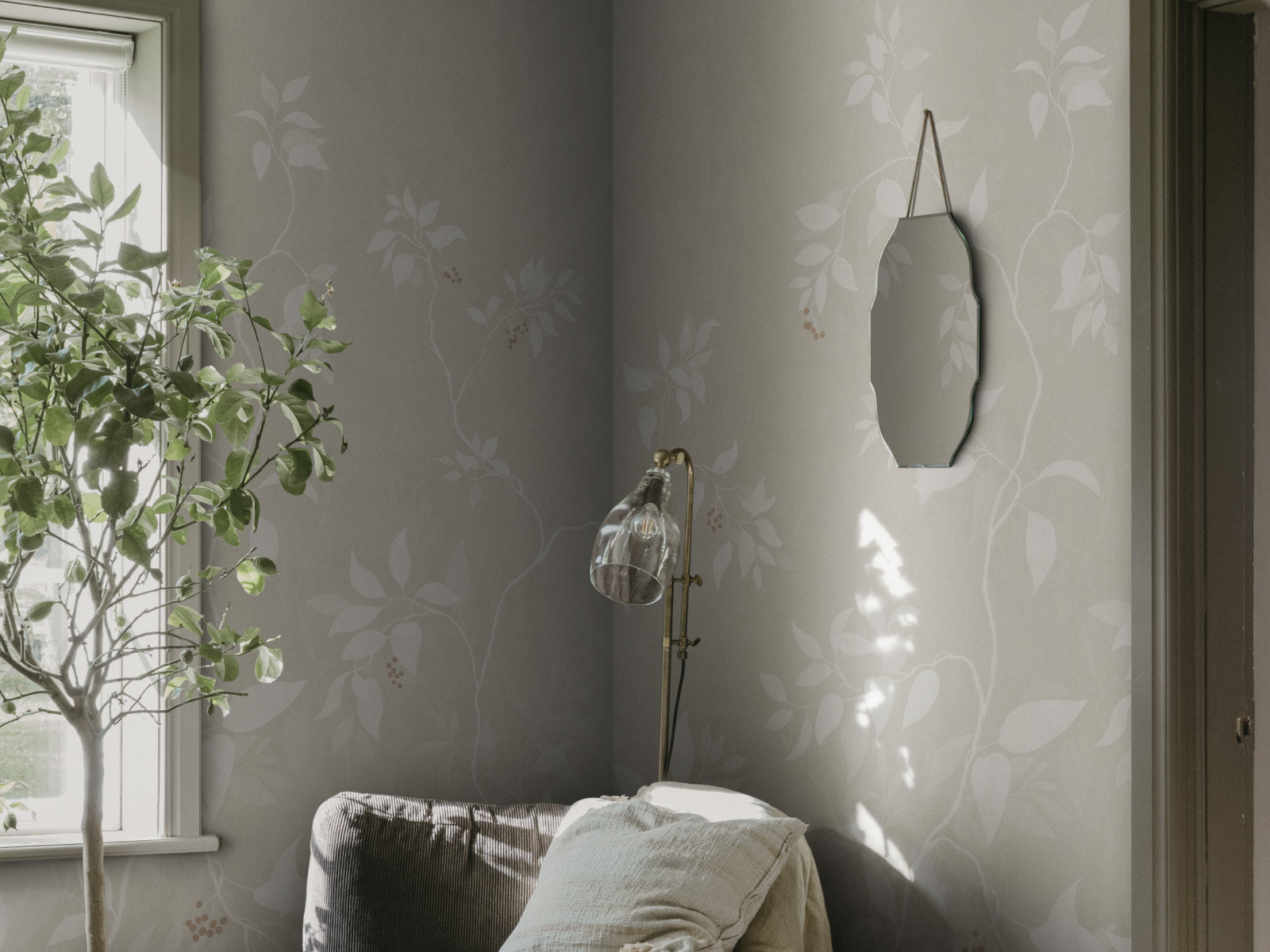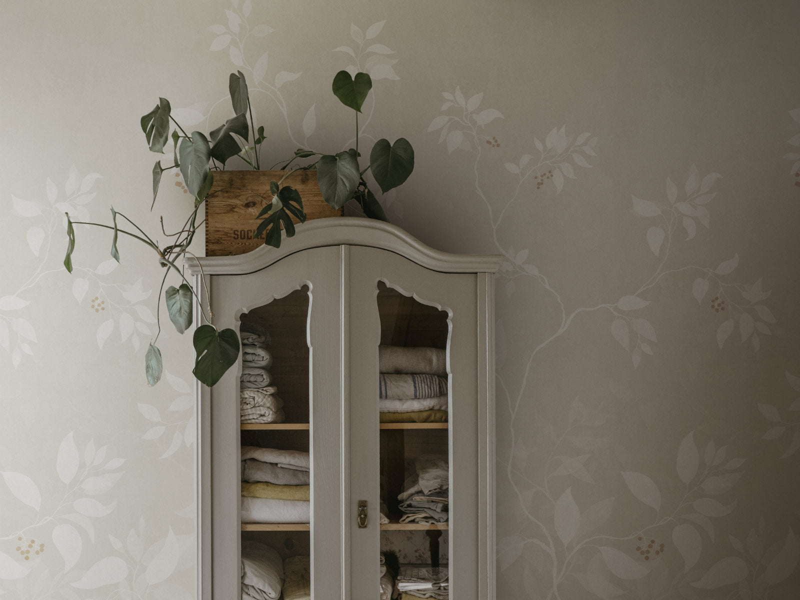 Het Sandberg Trädgården Josefine behang laat je wegdromen in een rustgevend, botanisch tafereel. Deze panorama toont groot formaat bloemen met sierlijk opklimmende stelen, subtiele bladeren en hier en daar kleine bessen. Dat zorgt voor een zachte, natuurlijke uitstraling en creëert een gevoel van diepte en elegantie op je muur. Ideaal voor wie een rustige, verfijnde sfeer in huis wil brengen.