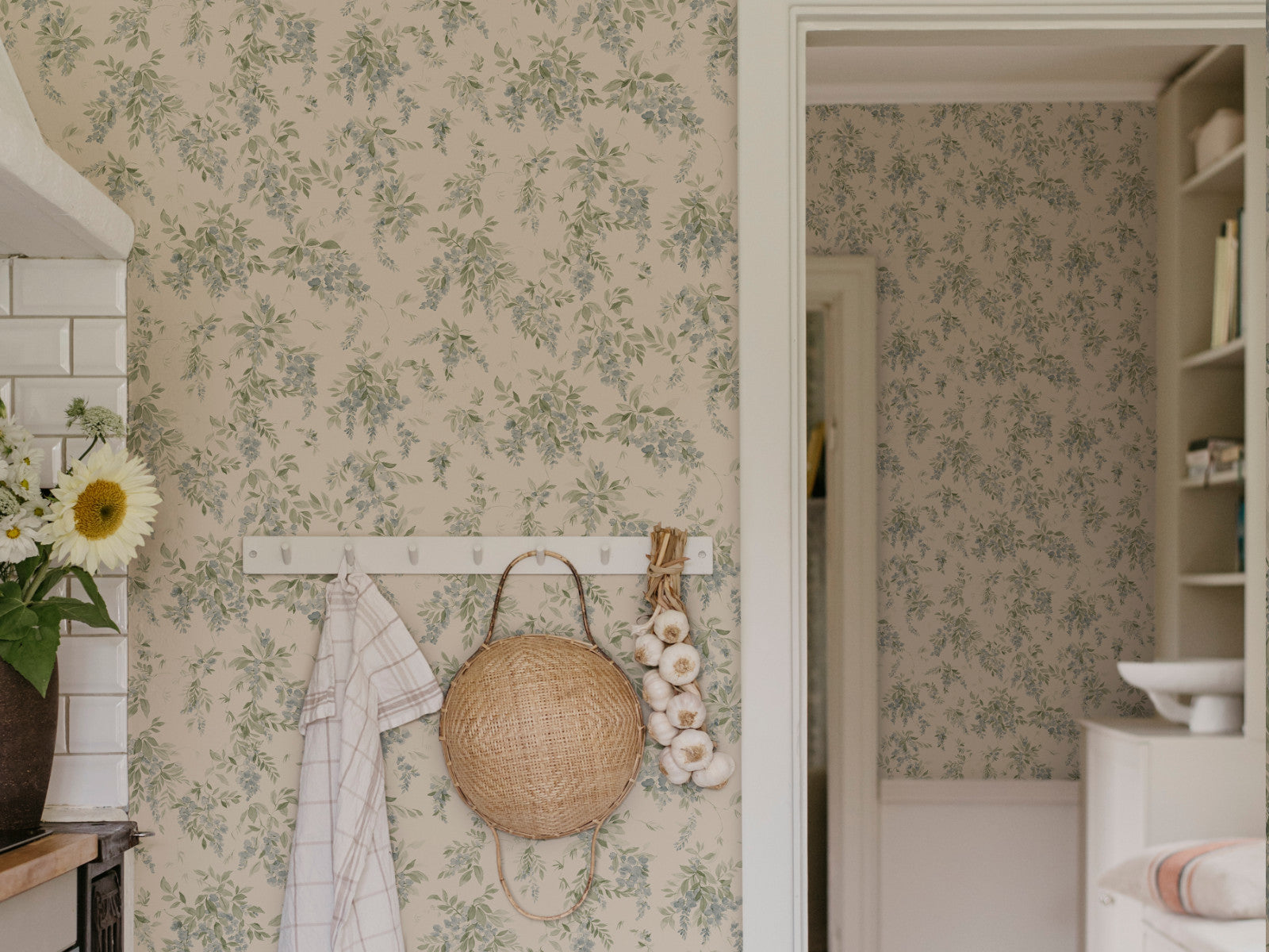 Breng romantiek en rust in je interieur met Sandberg Trädgården Lovisa, een aquarelachtig bloemenbehang dat landelijke charme moeiteloos combineert met een moderne twist. Het ontwerp toont sierlijke bloemen, tere bladeren en een vleugje lavendel, alsof ze met zorg met waterverf op de muur zijn geschilderd. De zachte kleurovergangen en botanische details geven elke ruimte een verfijnde en luchtige sfeer.