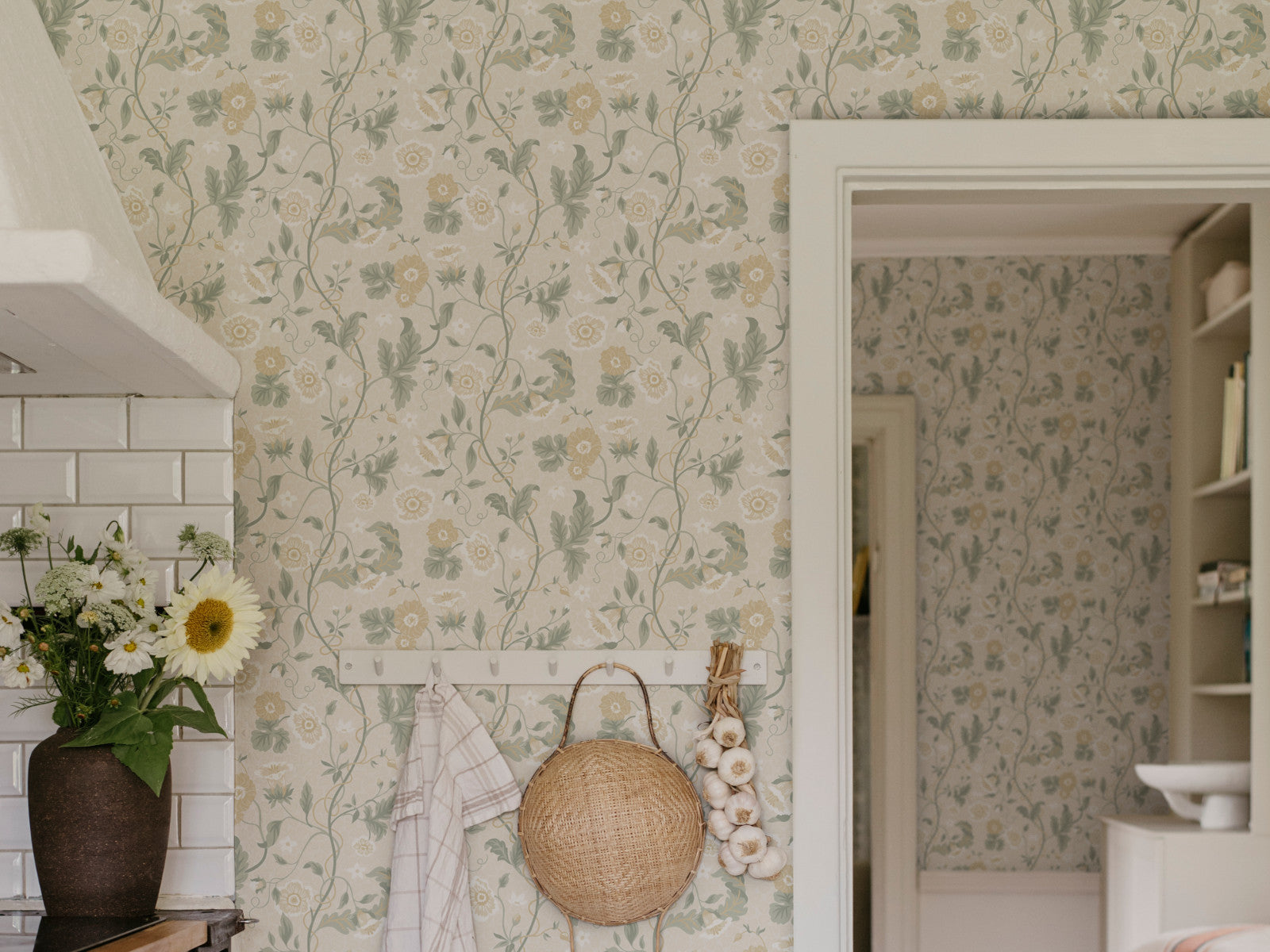 Laat je omringen door bloemrijke elegantie met Sandberg Trädgården Ulla, een verfijnd behang vol sierlijke bloemen en botanische details. Japanse anemonen, kop-en-schotelranken en avens slingeren zich subtiel door elkaar, ondersteund door fijne bladeren op de achtergrond. Het rijke patroon, geïnspireerd op de Arts & Craftsstijl, ademt romantiek en ambachtelijkheid, en maakt van elke muur een kunstwerk.