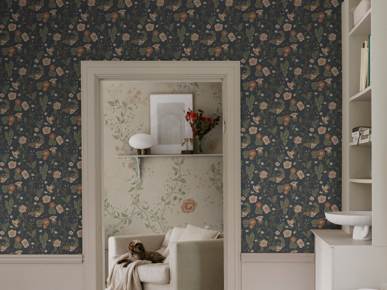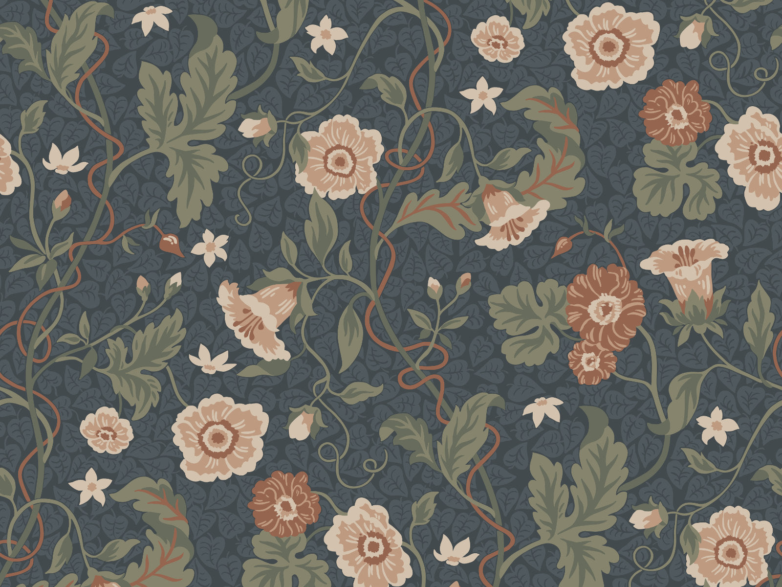Laat je omringen door bloemrijke elegantie met Sandberg Trädgården Ulla, een verfijnd behang vol sierlijke bloemen en botanische details. Japanse anemonen, kop-en-schotelranken en avens slingeren zich subtiel door elkaar, ondersteund door fijne bladeren op de achtergrond. Het rijke patroon, geïnspireerd op de Arts & Craftsstijl, ademt romantiek en ambachtelijkheid, en maakt van elke muur een kunstwerk.