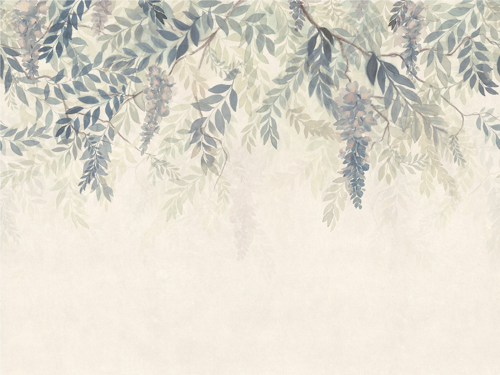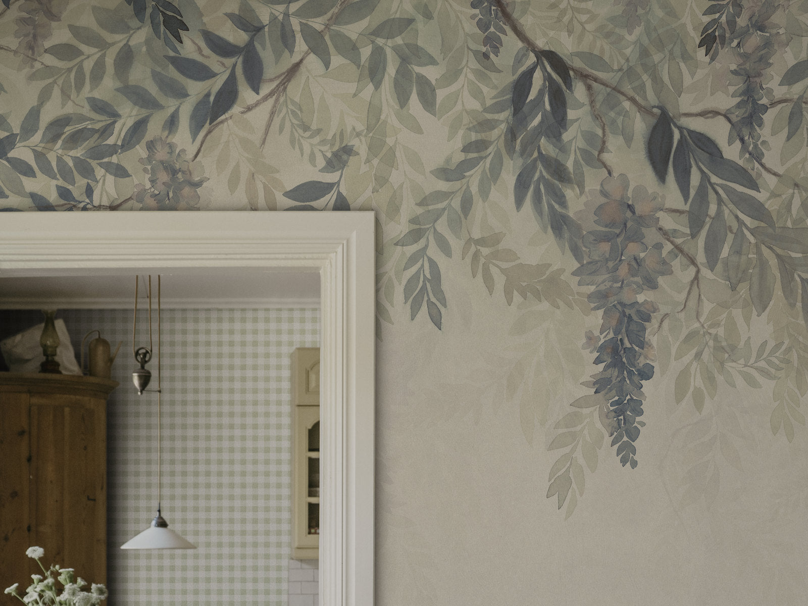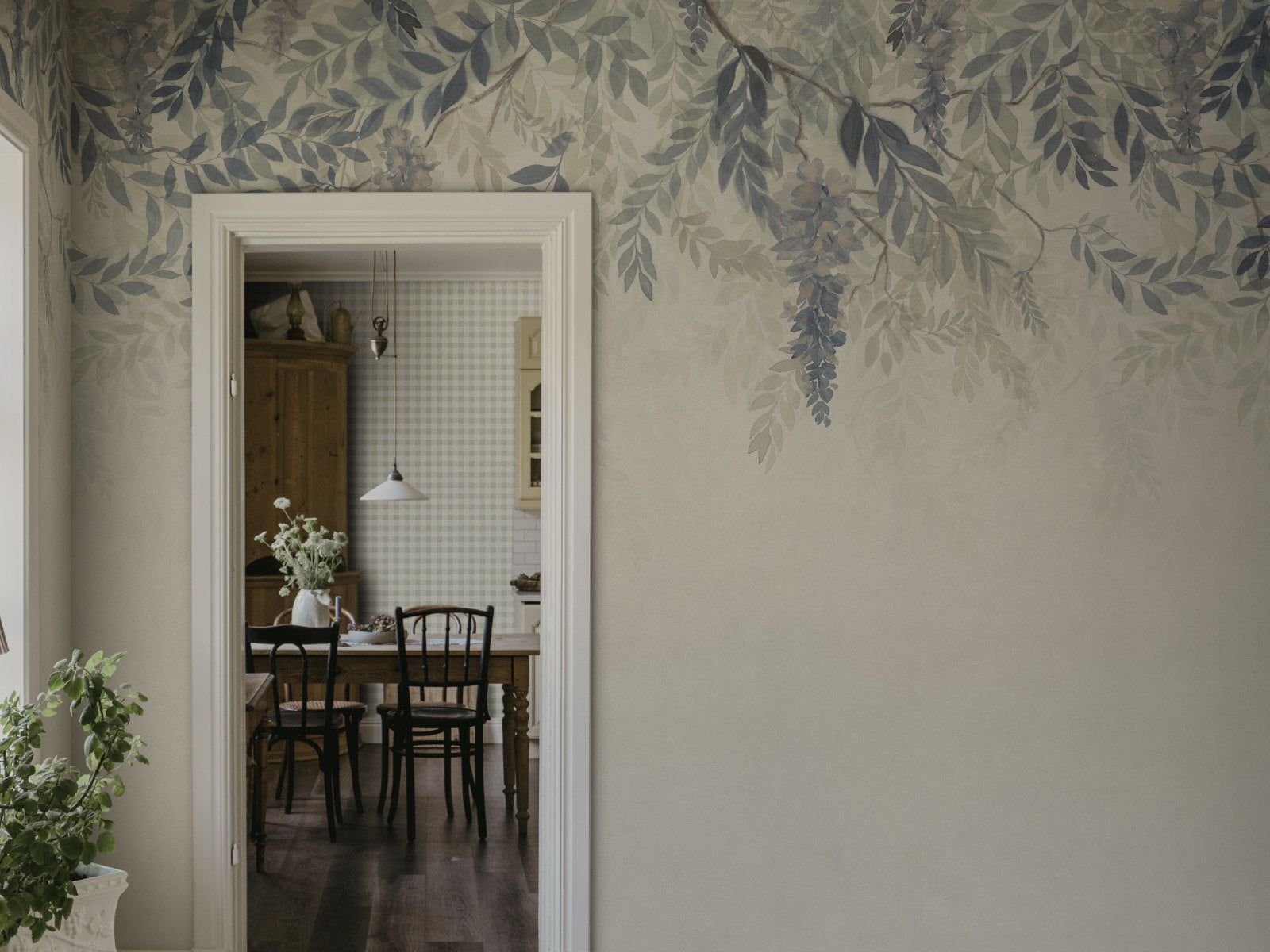 Laat je omringen door de dromerige schoonheid van bloeiende blauwe regen met het Sandberg Trädgården Wisteria behang. Deze botanische panorama brengt een weelderige tuin tot leven op je muur, met elegante trossen die doen denken aan druiven of bessen, omringd door zachte bladeren. De achtergrond vervaagt subtiel, wat zorgt voor diepte en een bijna schilderachtig effect. Verkrijgbaar in twee kleurvarianten, past dit panorama behang perfect in zowel rustgevende slaapkamers als stijlvolle woonkamers.