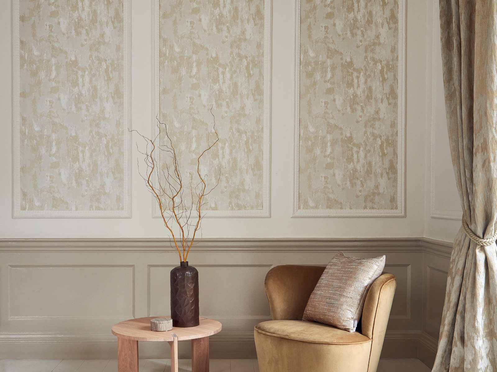 De Serene Intona - Pumice W556/02 van Villa Nova is geïnspireerd op de uitstraling van verouderde en afbladderende verfeffecten. Dit vinyl behang heeft subtiele metallic accenten die diepte en textuur aan het dessin toevoegen.